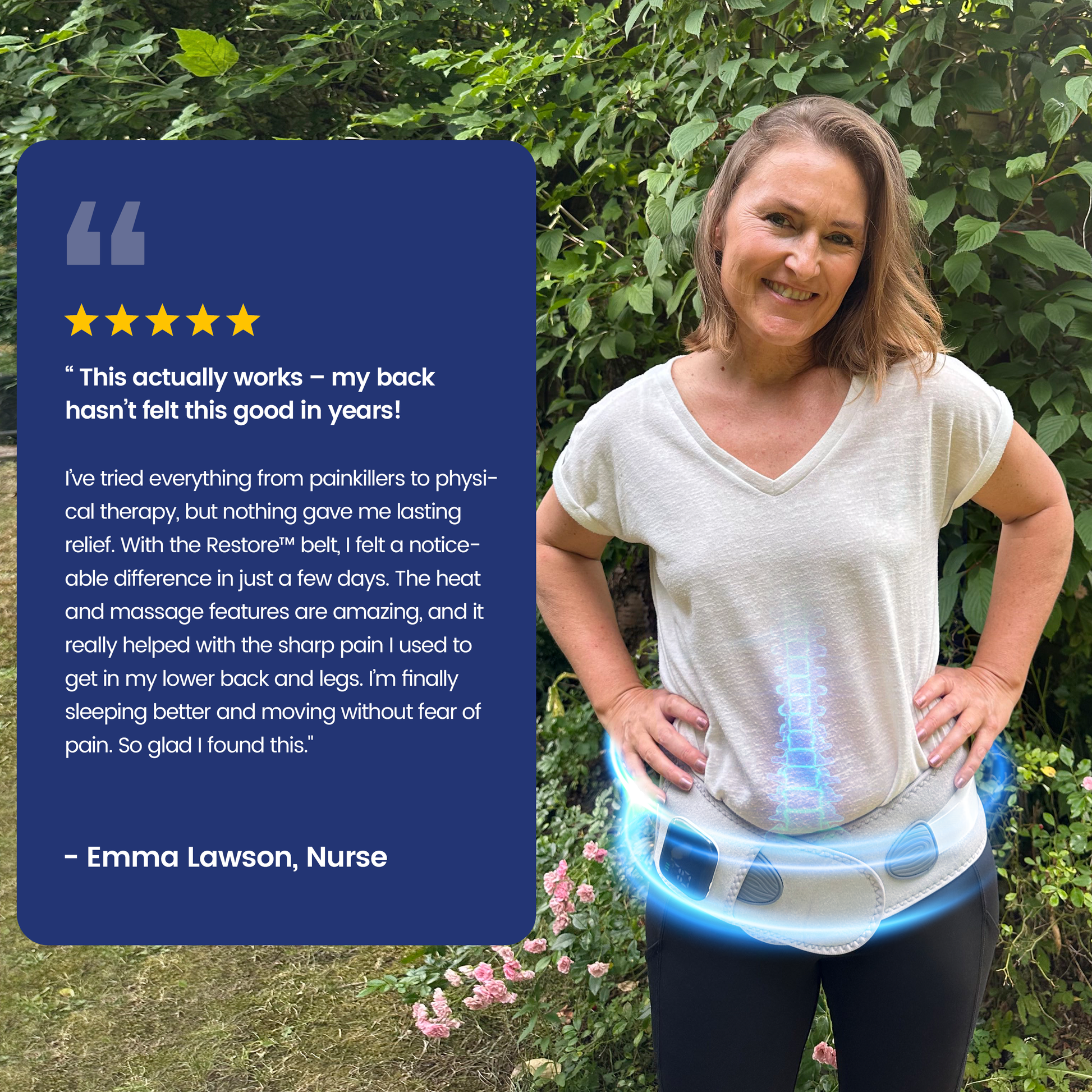 I’m a nurse, and long shifts used to wreck my back. The Restore Belt changed everything — I wear it under my uniform, and it gives instant relief and support. Now I finish my shifts pain-free and focused on my patients.
